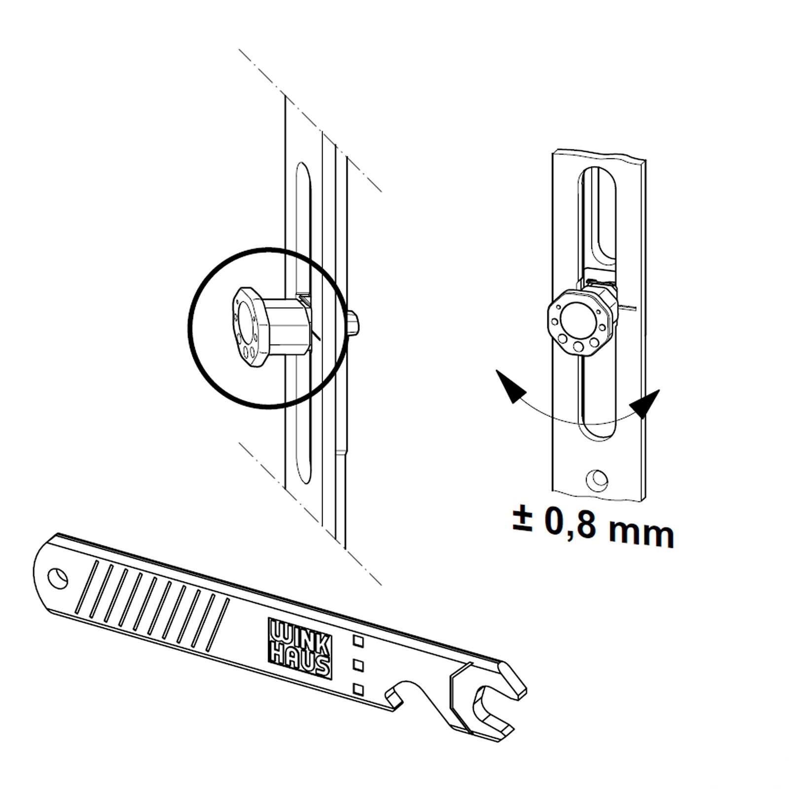– Verstell-/Justierschlüssel zur Regulierung des Anpressdrucks zwischen Flügel und Rahmen (±0,8 mm) durch Verdrehen des Achtkantbolzens (Pilzkopfschließzapfen)